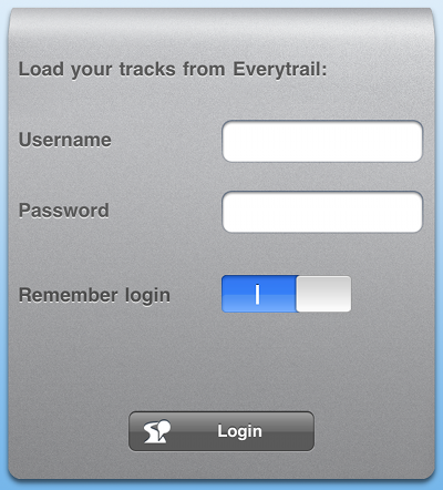 Füge Deinen Benutzernamen und Dein Passwort ein, um Tracks von everytrail zu laden. Deine Eingaben werden gespeichert, damit sie nicht jedes mal von Neuem eingeben werden müssen. Dies kannst Du verhindern, indem Du den Regler 'Remember Login' auf '0' schiebst.